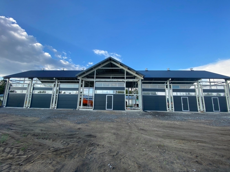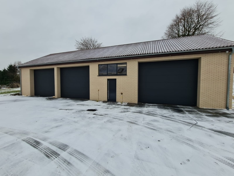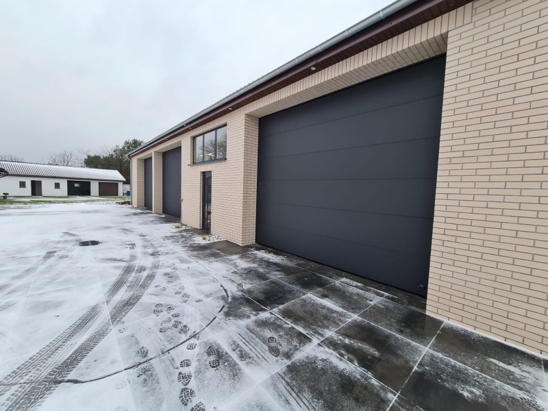 Potężna brama przemysłowa BiG TOR ISO60. Panel płaski, bez deseniowania POLYGRAIN RAL 9010 izolowany 60mm. Napęd nasadowy BiG TOR AUTOMAT OSE OKUCIA 3". Profil wzmacniający na każdej sekcji. Wymiary tych bram to B7000mmxH6000mm oraz B6000mmxH6000mm.