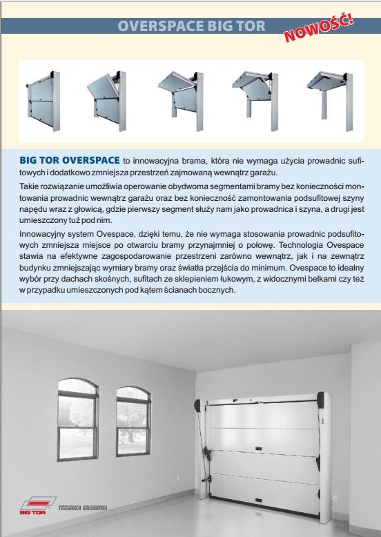BIG TOR OVERSPACE to innowacyjna brama który nie wymaga użycia prowadnic sufitowych i dodatkowo zmniejsza przestrzeń zajmowaną wewnątrz garażu.